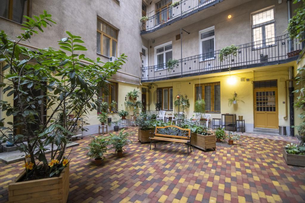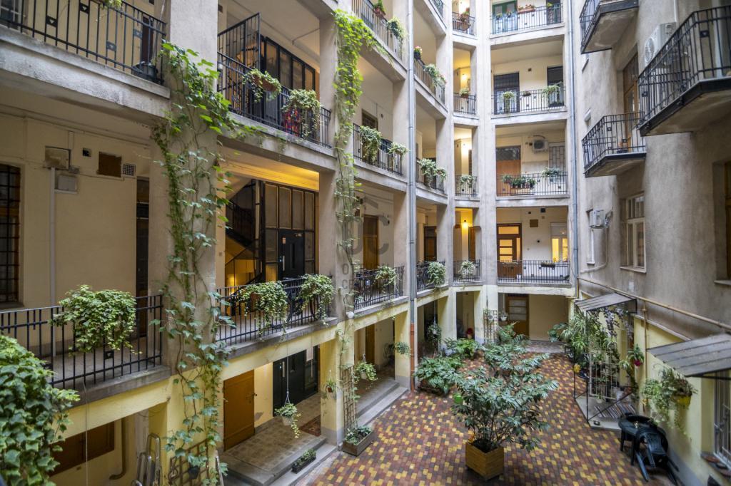 - hangulatos leburkolt és zöld növényekkel ellátott, szép belső társaházi udvar