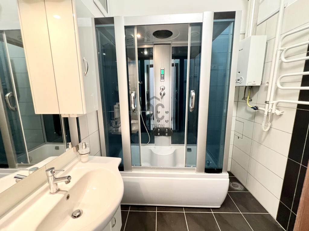 - a fürdőben beépített kabinos kád, különböző funkciókkal, törölközőszárító, ízléses csempe és járólap