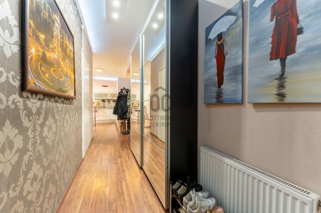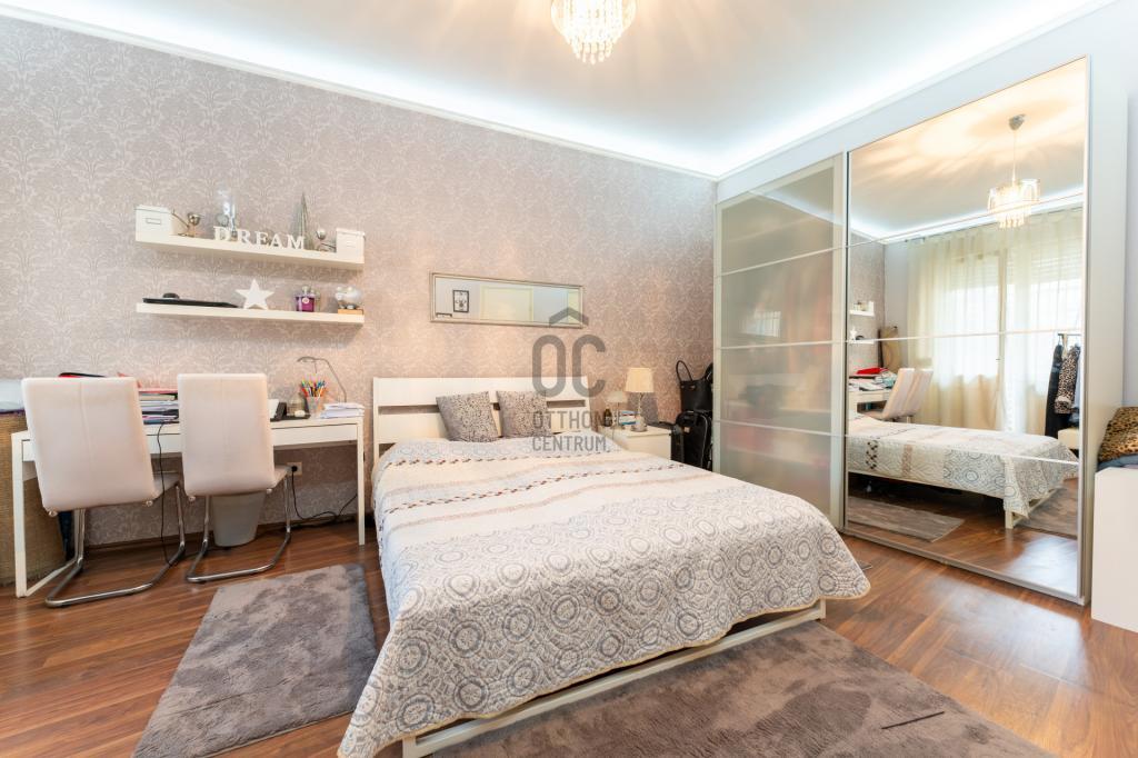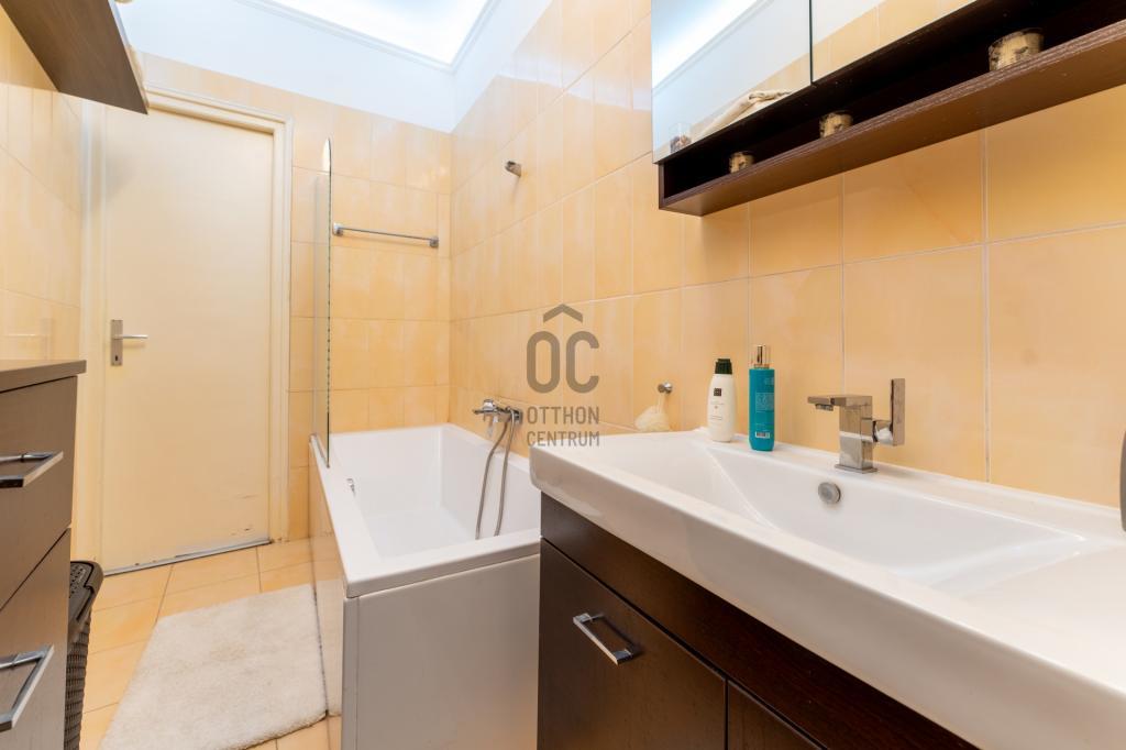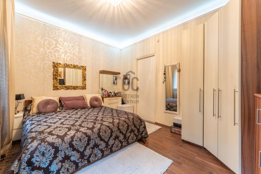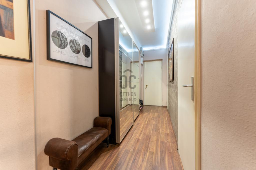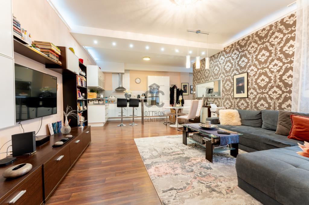 A lakás elosztása ideális és jól átgondolt: amerikai konyhás nappali étkezővel, két külön nyíló hálószoba, egy kádas fürdőszoba WC-vel, egy zuhanyzós fürdőszoba, külön WC, előszoba és háztartási helyiség található benne. Az ingatlanhoz tartozik egy 4 m²-es erkély, valamint egy 4 m²-es, zárható pincei tároló is.