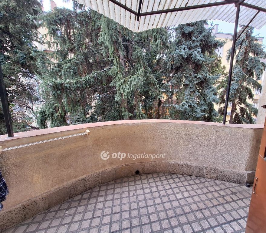 Az egyszobás lakás egy kétemeletes, téglaépítésű társasház első emeletén található, utcai kilátással. A lakás bejárata egy nagyobb, ráccsal zárható teraszról nyílik, amelyet a szomszédos lakással közösen használnak. A ház belső kertjében található fenyőfák kellemes, zöld környezetet biztosítanak, amely nyugodt hangulatot teremt az ingatlan körül.