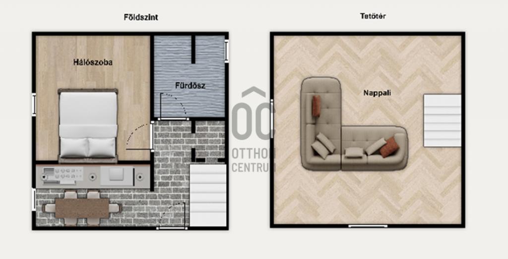 Kádas fürdőszoba wc-vel is itt található. Ezen kívül a hálószobát is itt találjuk.