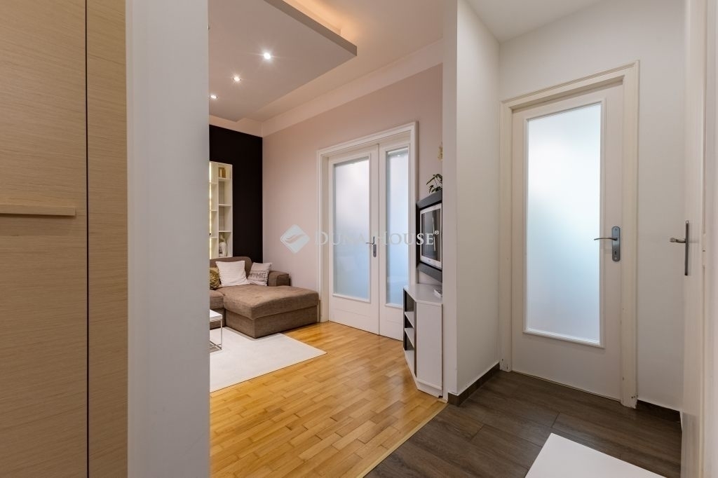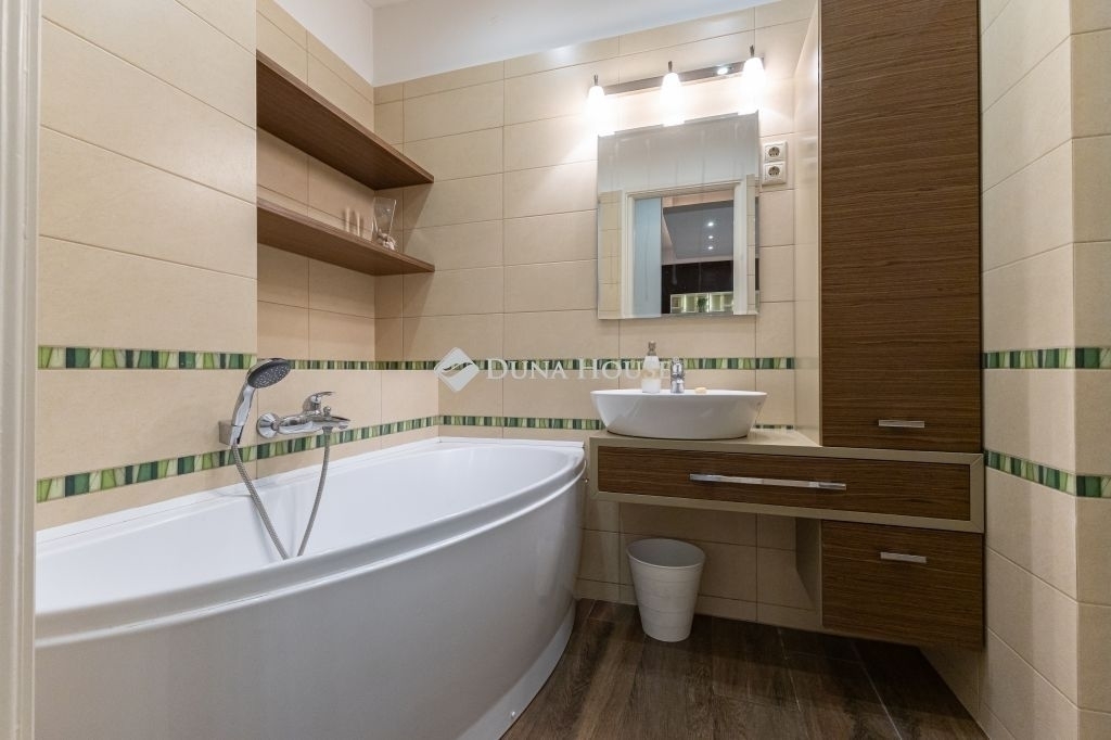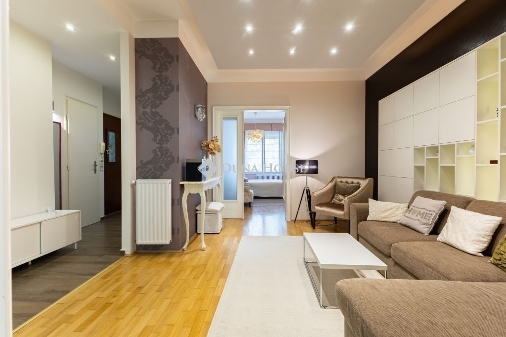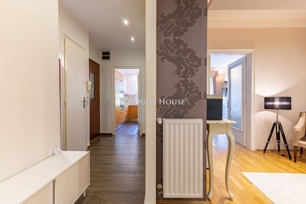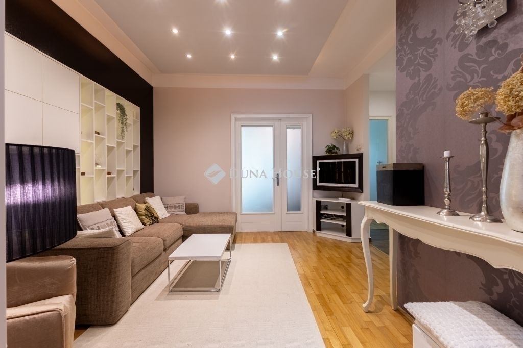 A szobák aljzatában a régi, halszálában rakott, valódi parkettet felszedték és modern divatos módon, kötésben tették vissza. Az egyéb helyiségek kerámia lappal burkoltak. Számos gipszkarton dobozolással, modern tereket alakítottak ki a különböző hangulatvilágítások elhelyezésére. Átalakításra került a fürdőszoba, ahol egy sarokkád és egy zuhanyzó kapott helyet. A lichthofra szellőztetethető WC, külön-bejárattal érhető el. A lakás nyílászárói az építéskorabeli fa szerkezetek, szépen felújítva, elektromos redőnnyel szerelve, a konyha ablaka hőszigetelő üvegezésű műanyag szerkezet. A konyhában modern konyhabútor került beépítésre, AEG márkájú gépészettel, amely a vételár részét képezi, csakúgy, mint a lakásban található összes egyéb bútor.