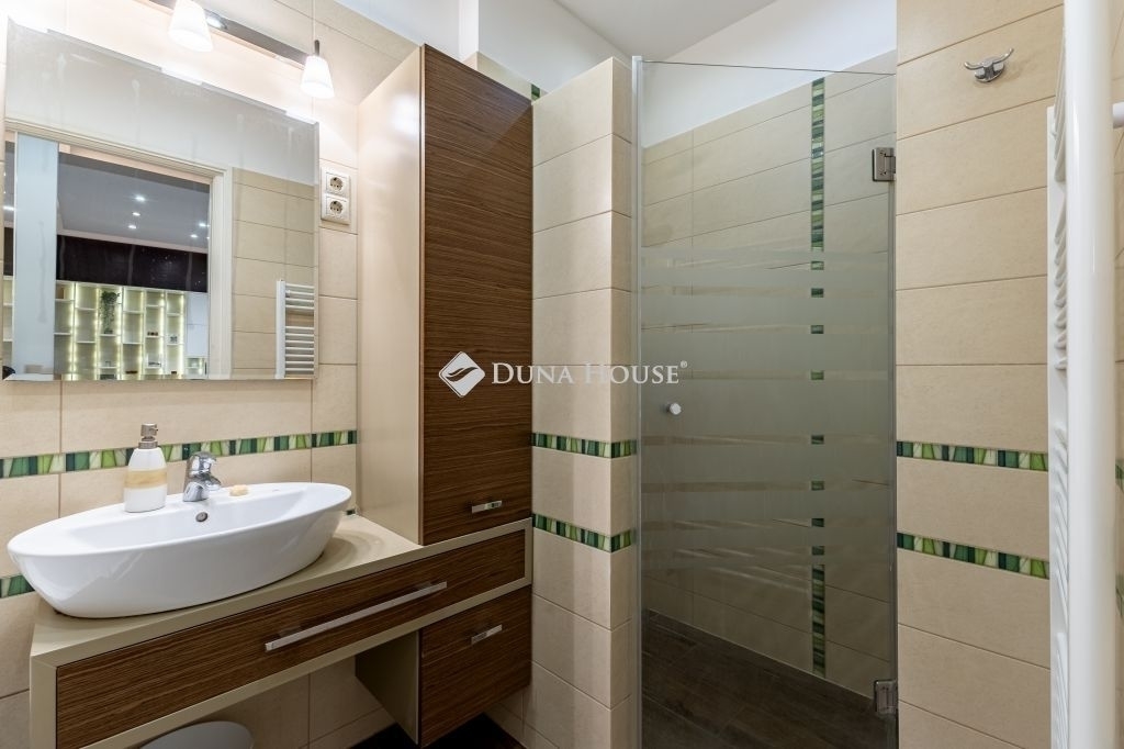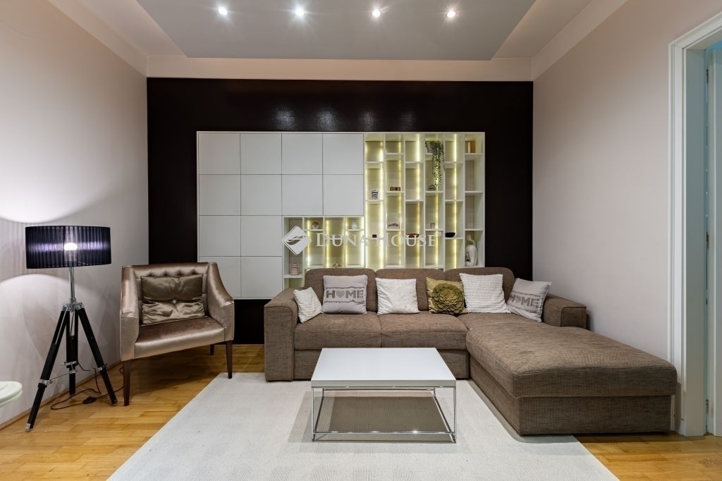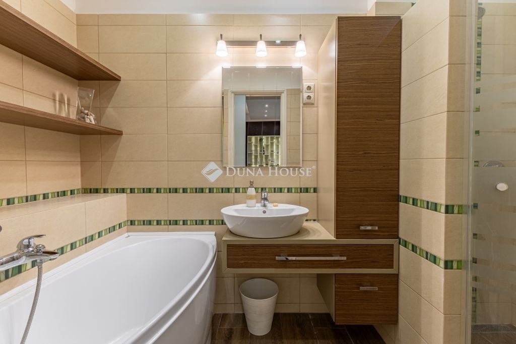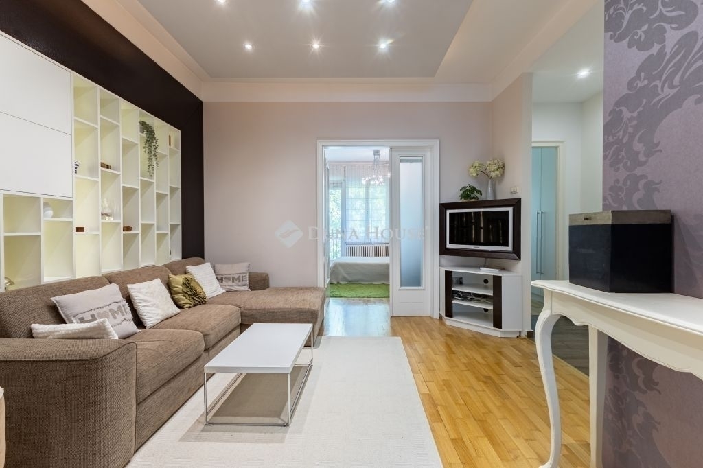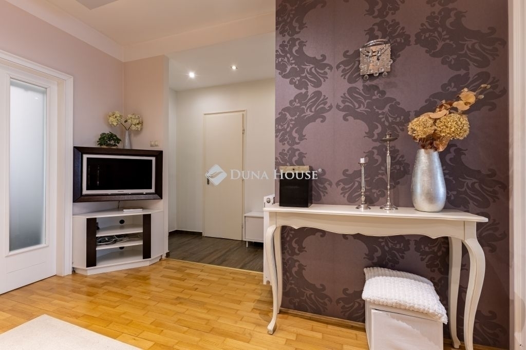 A szobák aljzatában a régi, halszálában rakott, valódi parkettet felszedték és modern divatos módon, kötésben tették vissza. Az egyéb helyiségek kerámia lappal burkoltak. Számos gipszkarton dobozolással, modern tereket alakítottak ki a különböző hangulatvilágítások elhelyezésére. Átalakításra került a fürdőszoba, ahol egy sarokkád és egy zuhanyzó kapott helyet. A lichthofra szellőztetethető WC, külön-bejárattal érhető el. A lakás nyílászárói az építéskorabeli fa szerkezetek, szépen felújítva, elektromos redőnnyel szerelve, a konyha ablaka hőszigetelő üvegezésű műanyag szerkezet. A konyhában modern konyhabútor került beépítésre, AEG márkájú gépészettel, amely a vételár részét képezi, csakúgy, mint a lakásban található összes egyéb bútor.