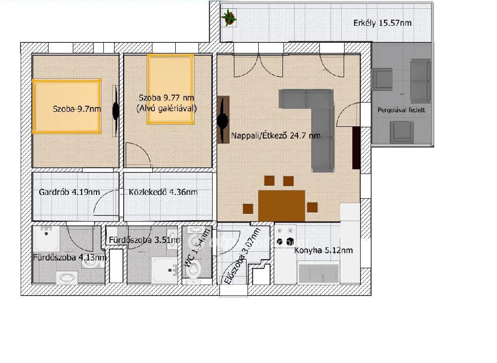 For sale: a modern, well-designed apartment built in 2020 by Biggeorge, located on the 3rd floor of a residential building in Beregszász Street, Sasad. The property offers a comfortable, spacious layout with a large balcony featuring a built-in pergola, making it enjoyable all year round.