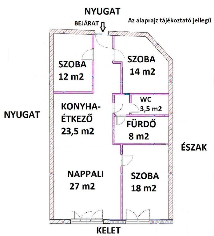 A lakás keleti tájolású, két hálószobában tetőablak biztosít természetes fényt a nap későbbi szakaszában is.