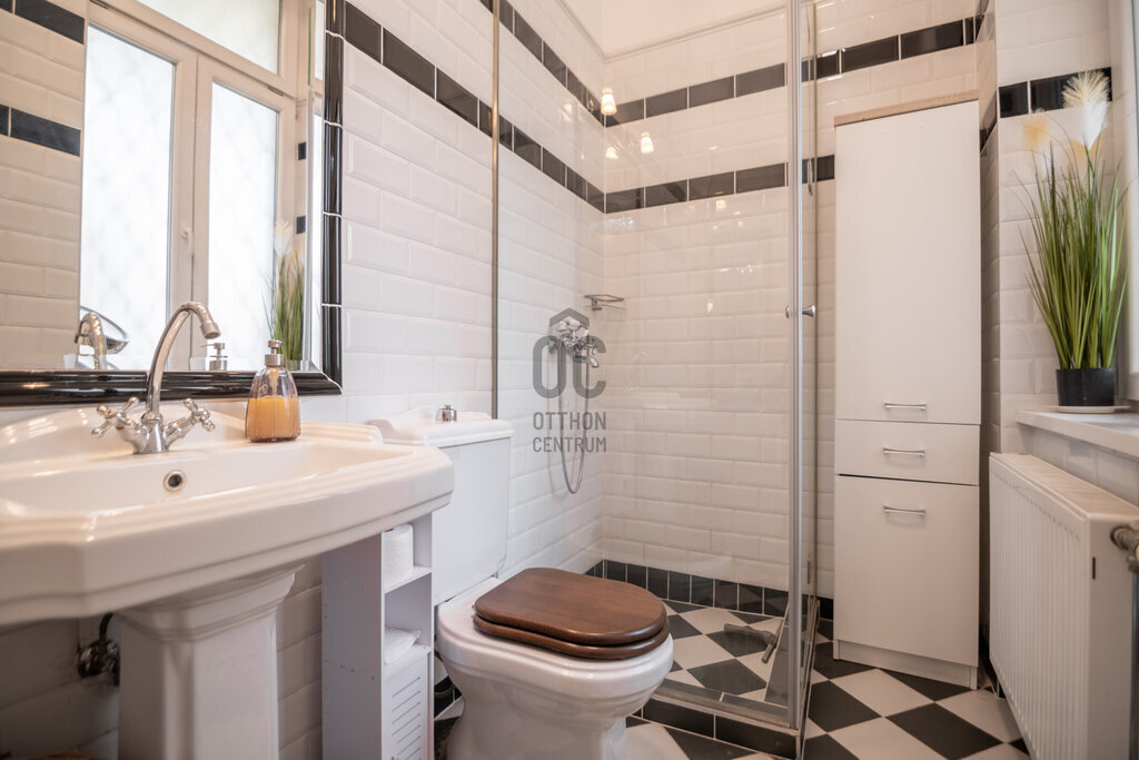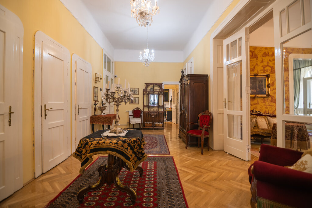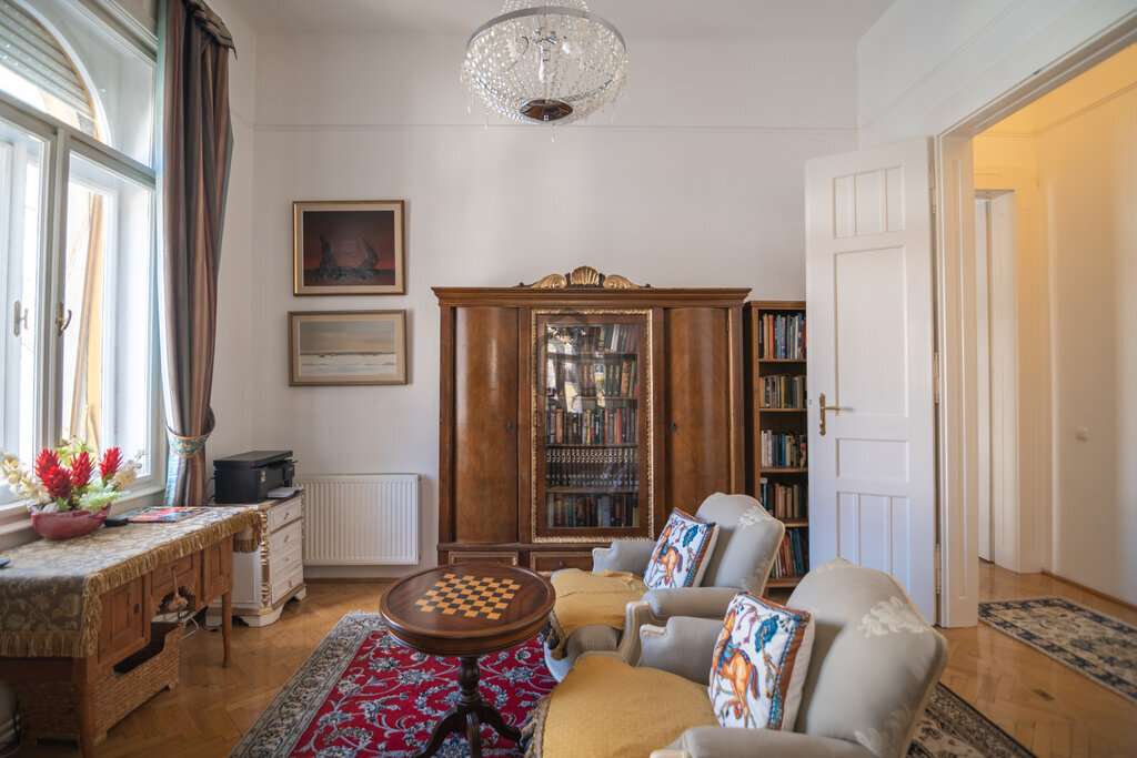 A régi nagyméretű kétszárnyú ajtók is kifogástalan állapotban vannak, még tovább fokozva ezzel a lakás nagypolgári, korhű mivoltát.