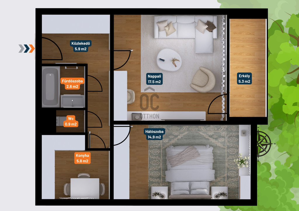 Utcai nézetű, 5,3 m²-es beépített erkéllyel rendelkezik, a nappaliból közvetlen kijárattal.