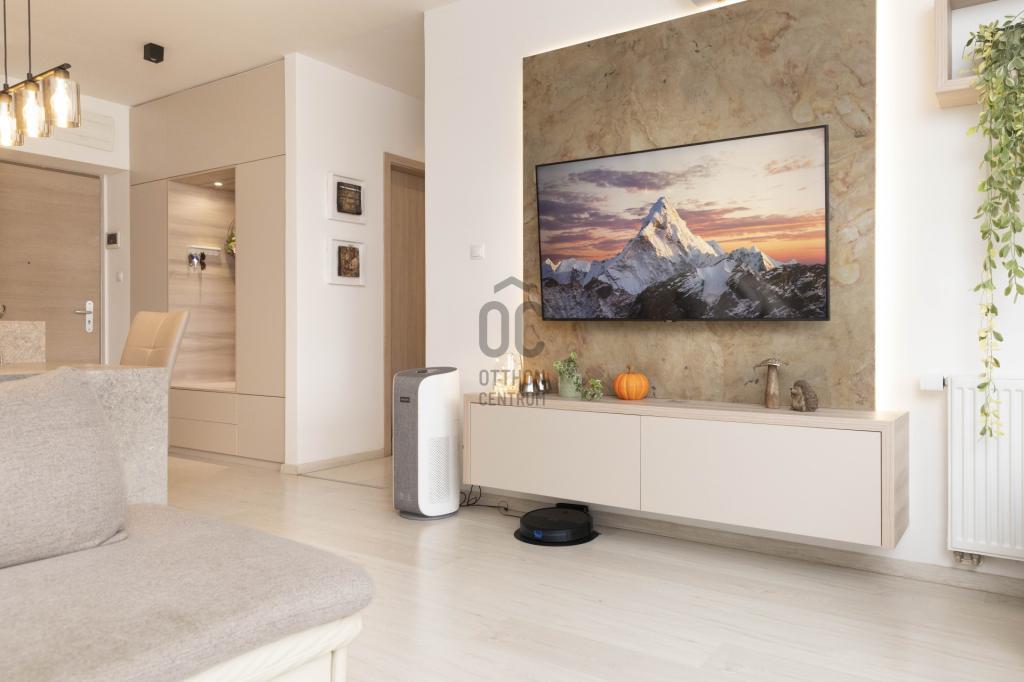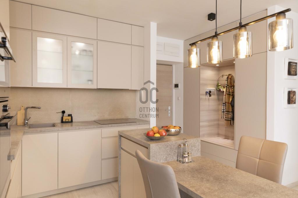 A lakás központja egy tágas, stílusos élettér. A konyha teljesen gépesített (beépített hűtő-fagyasztó, sütő, mikró, mosogatógép, főzőlap, elszívó), külön konyhaszigettel és bőséges tárolóhellyel. Az étkezőhöz egyedi, beépített asztal tartozik. A nappali és az előszoba részen beépített gardrób, TV-konzol és polcrendszer kapott helyet.