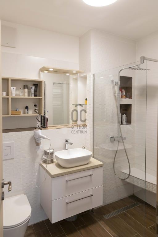 Letisztult kialakítású, épített zuhanyzóval és praktikus beépített polcokkal.
