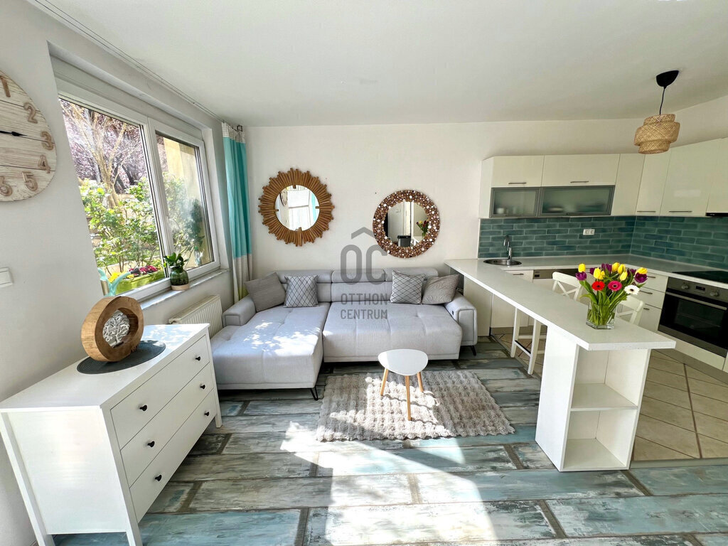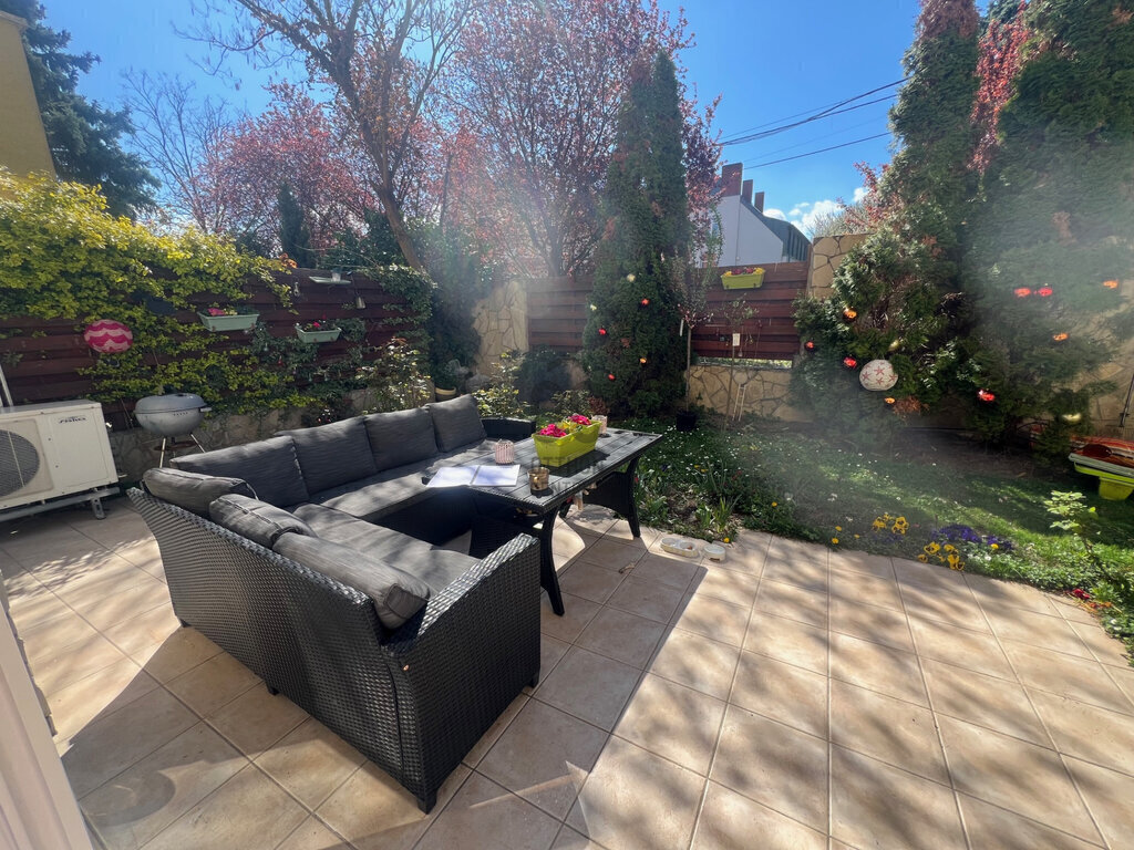 Az ingatlan igazi különlegessége a 19 m²-es terasz és a saját, 100 m²-es kert, amely ritka lehetőség a fővárosban – lakás kényelme, családi ház hangulata egyben.
