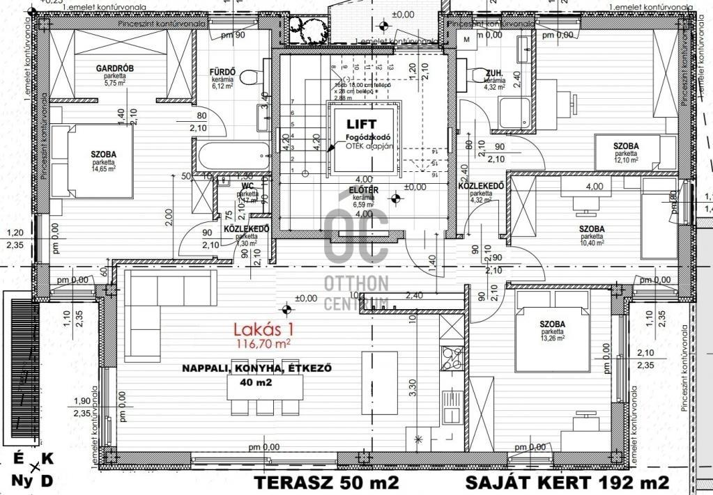 FSZT.: 142 m2 (50 m2 terasz 1/2 méretének a beszámítása mellett. A terasz nélküli nettó alapterület 117 m2), DNY-i, 5 szobás, 2 fürdőszobás, 2 db teremgarázs hely (+10 Mft/db), 5,5 m2 tárolóval (+5,5 Mft) és 192 m2 saját kert.