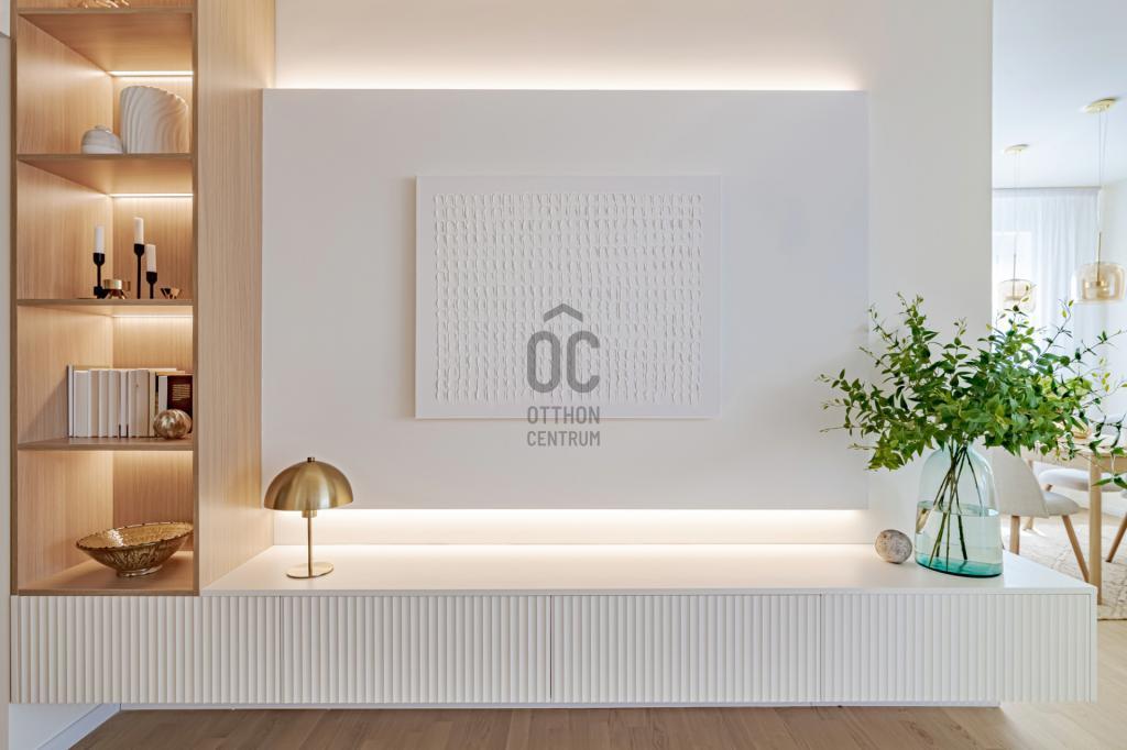 A nappali a lakás központi éke: tágas, rendkívül világos, zöldre néző ablakokkal és stílusos, egyedi készítésű médiafallal.