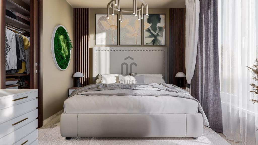 A laká eredetileg 51m²-es lakótérrel és egy 17 m²-es iroda besorolású térrel lett összenyitva, így ideális választás lehet olyan vásárlóknak, akik egy gyerekkel költöznének vagy háziállat miatt fontos a kertkapcsolat. Fontos megemlíteni, hogy az ingatlan az Otthon Start program keretében is megvásárolható, mivel a lakás részére az már ingatlanként elérhető, így kedvező finanszírozási lehetőségeket nyithat meg a vásárlók számára.