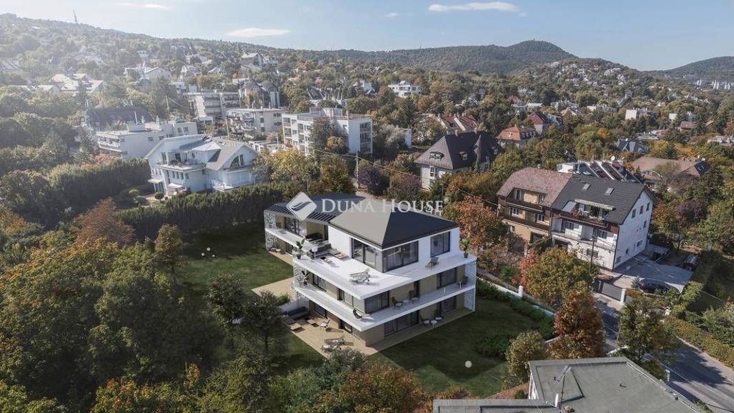 Megújuló energia, fűtő-hűtő rendszer, felső kategóriás anyaghasználat, nagy teraszok, élhető zöld terület.