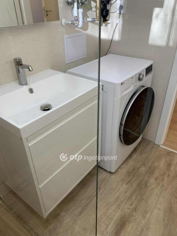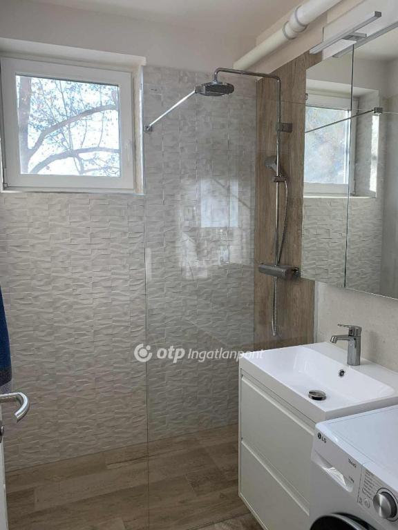 A fürdőszoba zuhanyzós, benne új mosógép és egy szintén új westen márkájú gázcirkó készülék, amely a melegvizet szolgáltatja és a lakás önálló fűtését, radiátoros hőleadással.