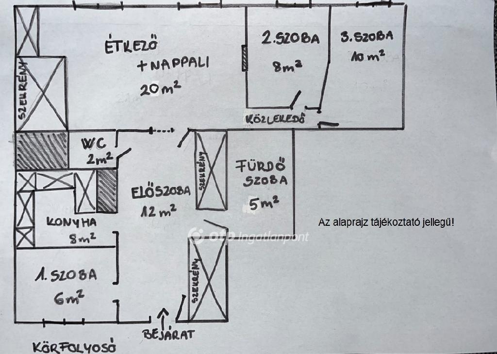 A tulajdoni lap szerinti, eredetileg kétszobás lakás jelenleg egy szoba és három félszoba elrendezésü. Korszerű, nagyméretű, műanyag nyílászáro/ók jó benapozást biztosítanak. Nagy belmagasságú terek. A lakás teher és igénymentes.