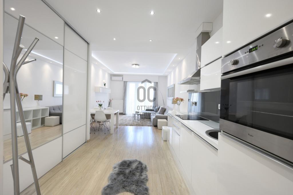 - Modern, gépesített konyha: mosógép, hűtő, mosogatógép, villanysütő, kerámia főzőlap, páraelszívó, mikró,