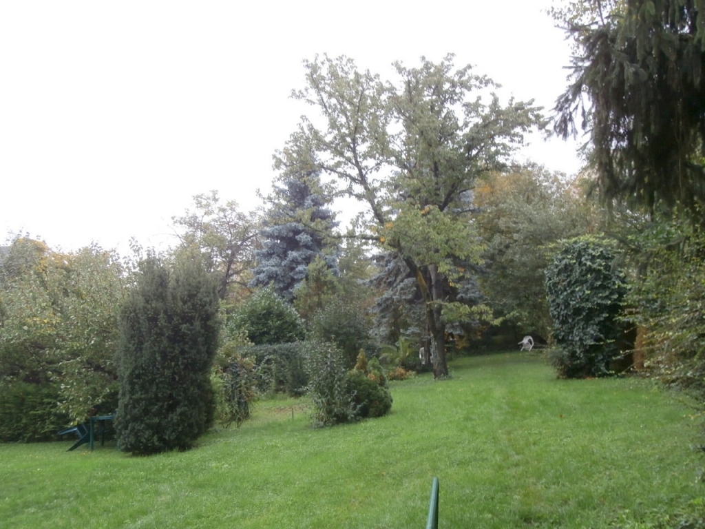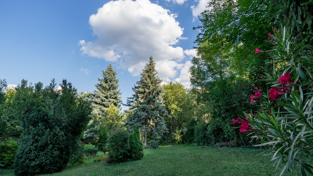 Hatalmas fenyők, lombos fák, növényfal és gondozott pázsit biztosítják a természetközeli környezetet és a csendet.