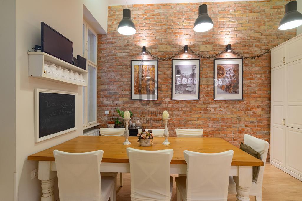 Konyha: a burkolat olasz kerámia lap, angol metro csempe (fehér és spanyol mintás kivitel), külső szeletes bontott téglafal. IKEÁ-s konyhabútor fiókvilágításokkal, motoros szelektív szeméttároló. Electrolux gőzpároló sütő, hob to hood rendszerű indukciós nagy méretű főzőlap és elszívó rendszer, AEG mosogatógép, amely applikációval vezérelhető, Bosch kombinált hűtőszekrény.