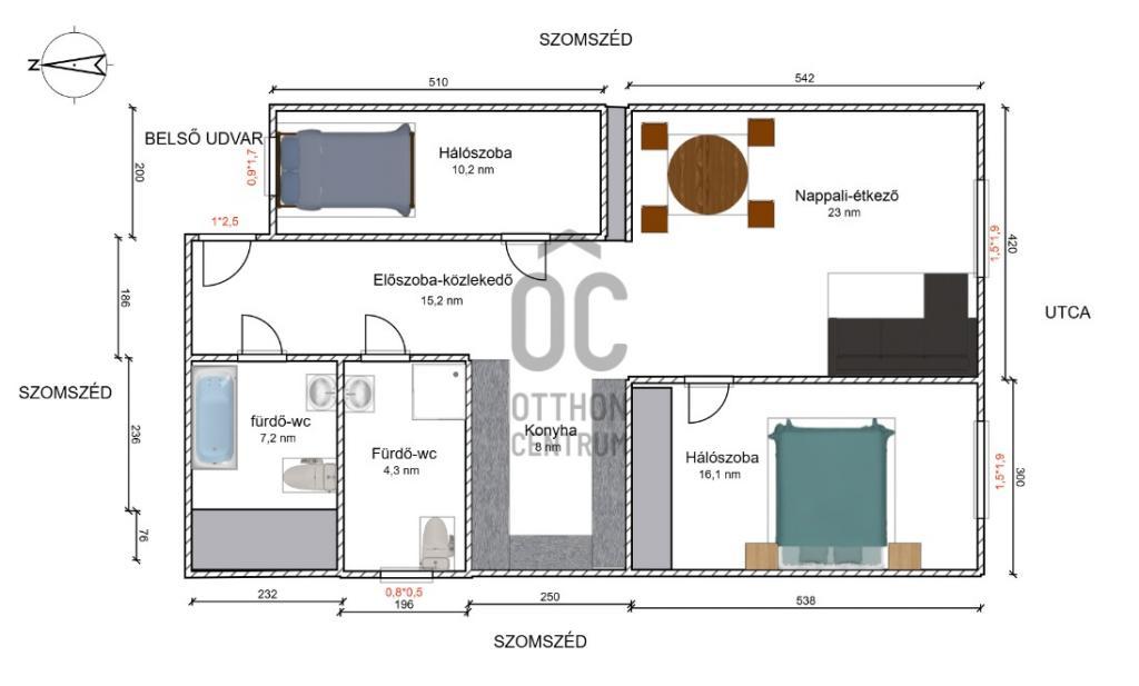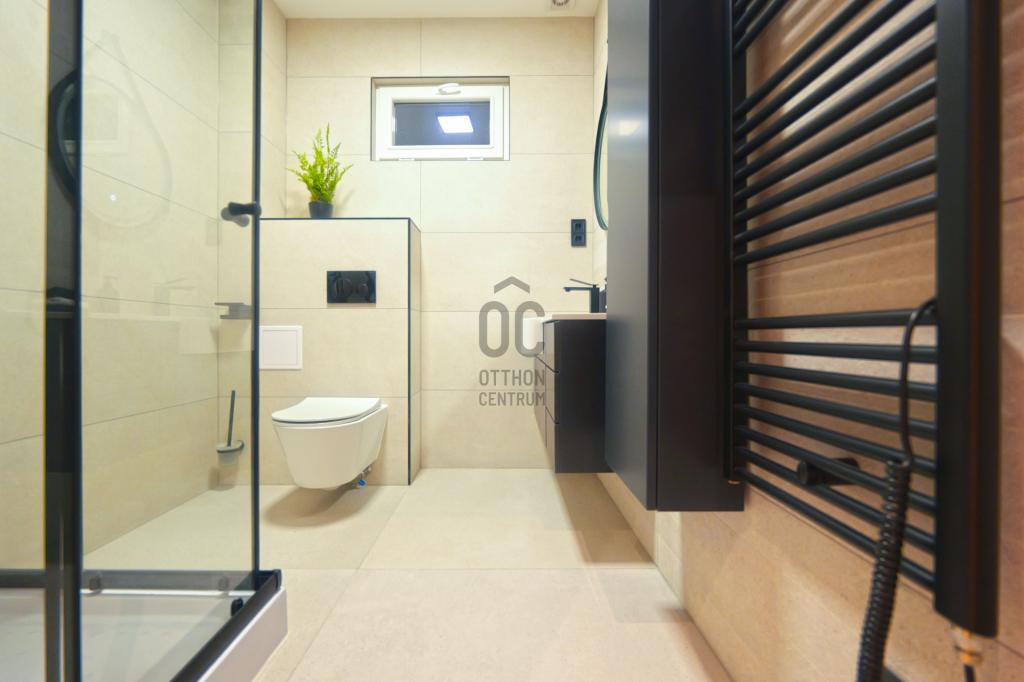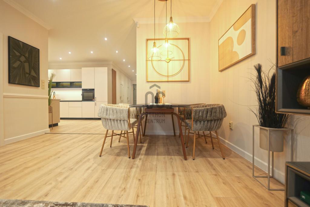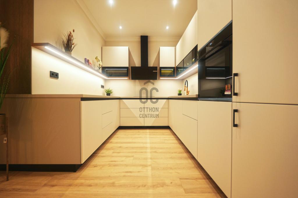 - A nappali, konyha és előtér közel 40 m²-es összefüggő teret alkotnak, amely rendkívül világos és tágas hatást biztosít.