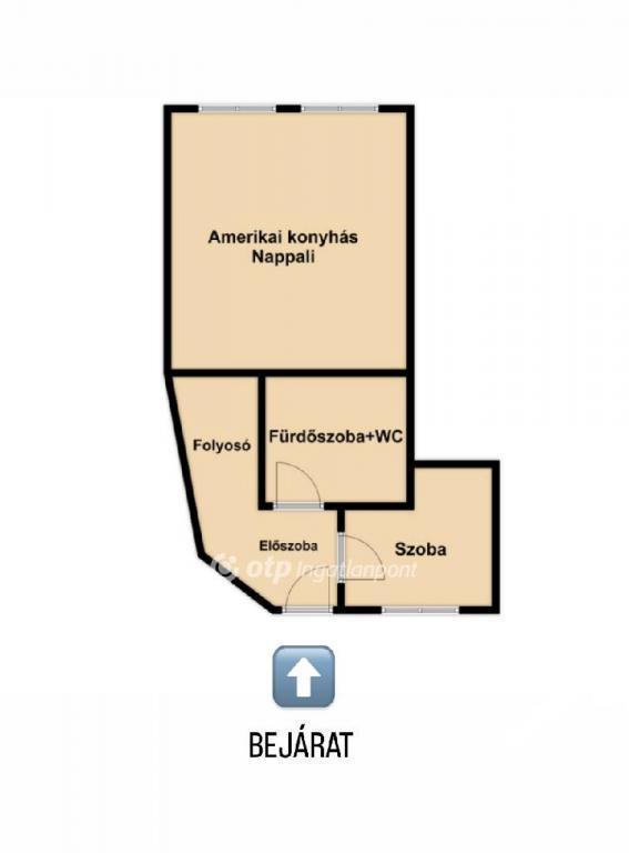Elrendezés: amerikai konyhás nappali + külön nyíló hálószoba