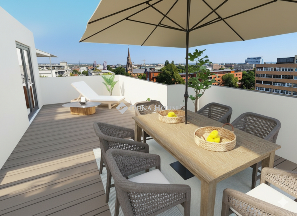 Modern penthouse lakás a Central Parkban 180°-os panorámával és álomterasszal!Budapest XIII. kerületének szívében, a Lehel úton, kínálunk megvételre egy különleges, 8. emeleti, keleti tájolású penthouse lakást, amely egyszerre nyújt modern városi életérzést és nyugodt otthont.Az ingatlan bruttó 72 m²-es (nettó 39 m² lakótér + 33 m² terasz), tulajdoni lapon 55 m².A tágas, világos nappaliból és a teraszról lenyűgöző, 180°-os panoráma tárul elénk, amely minden nap új élményt kínál legyen szó reggeli kávéról a napfelkeltében, vagy egy esti borozásról a város fényei alatt.Ami igazán különlegessé teszi:- Jelenleg egy légterű, de könnyedén leválasztható egy külön hálórész, így a lakás még praktikusabbá és otthonosabbá tehető.- A kialakítási lehetőségek bemutatására 3D látványtervek is rendelkezésre állnak, hogy a leendő tulajdonos könnyen elképzelhesse saját álomotthonát.- Penthouse jelleg, nagyméretű terasz, páratlan térélmény.- Modern elrendezés, napfényes terek, alacsony rezsiköltség (B energetikai besorolás).- Kiváló közlekedés: busz- és villamosmegállók közvetlenül az épület előtt.A lakás ideális választás mindazoknak, akik:- egyediséget és panorámát keresnek,- első otthonukat vásárolnák akár 3%-os kedvezményes hitellel,- vagy olyan befektetést keresnek, amely könnyen bérbe adható a lokáció és a különleges adottságok miatt.Az ingatlan a képeken látható bútorokkal együtt eladó, így azonnal költözhető.Érdeklődés esetén keressen bizalommal, akár hétvégén is ne maradjon le erről az igazán ritka lehetőségről! Hibás hirdetés bejelentése