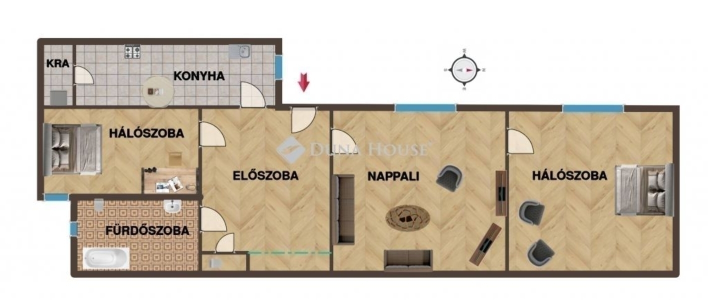 Elrendezése: nappali, hálószoba, félszoba, étkezős konyha, kamra, fürdőszoba és előszoba.