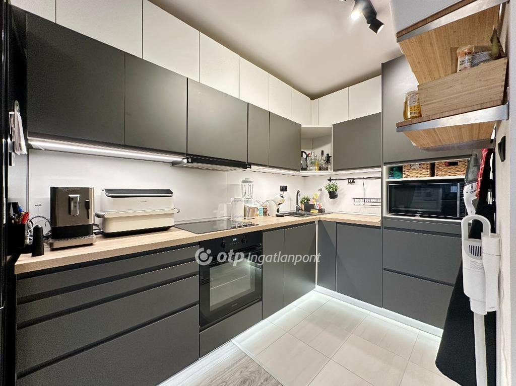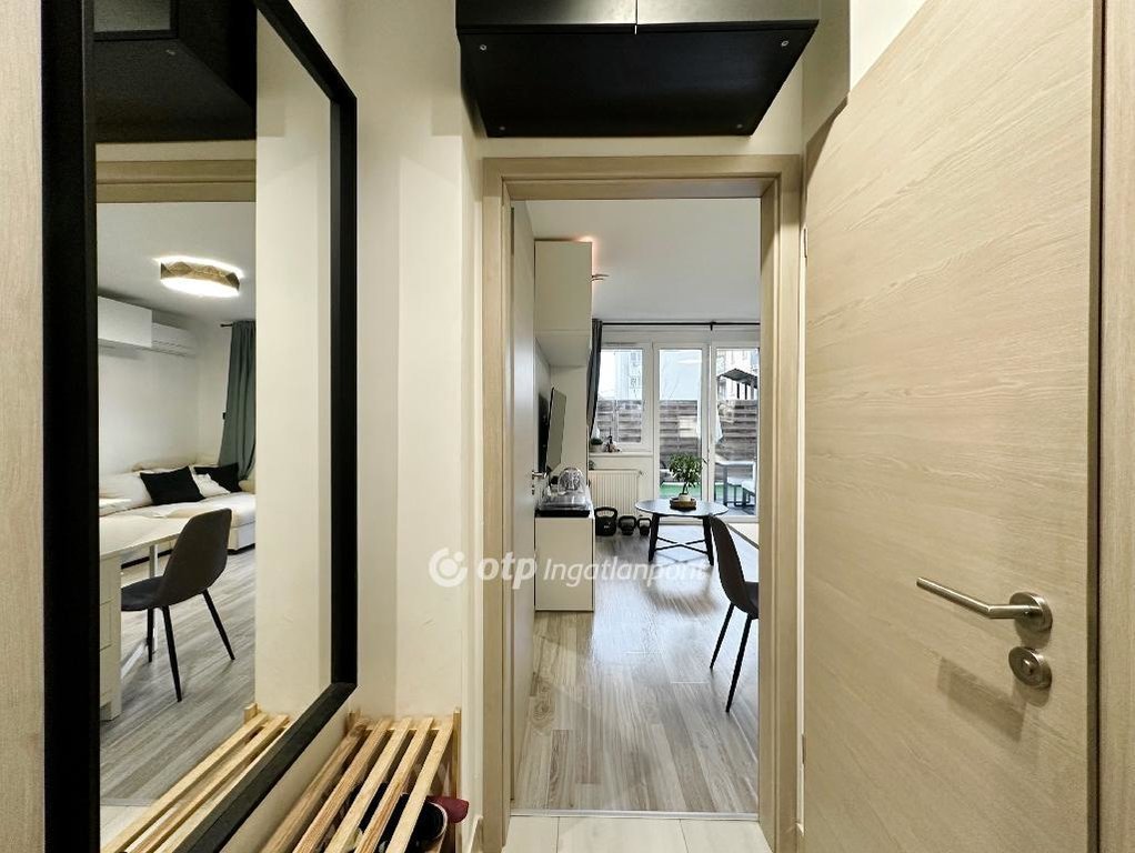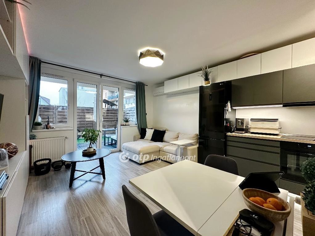 A nyugati tájolású ingatlan nagy üvegfelületeinek köszönhetően egész nap világos, a kert előtt lévő szabad tér pedig különösen tágas, nyugodt térérzetet ad, gyönyörű naplementével. Az amerikai konyhás nappali tágas, a konyhabútor mérete a megszokottnál nagyobb, a nappaliban pedig telefonról vezérelhető, wifi-s klíma biztosítja a kényelmet. A hálószoba teljes értékű, gardróbszekrénnyel és dolgozósarokkal, így akár home office-ra is kiválóan alkalmas. A lakásban külön WC és kádas fürdőszoba található, beépített szellőztetéssel.