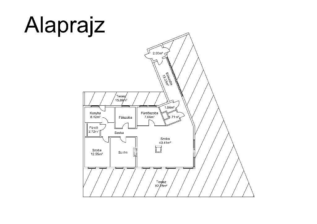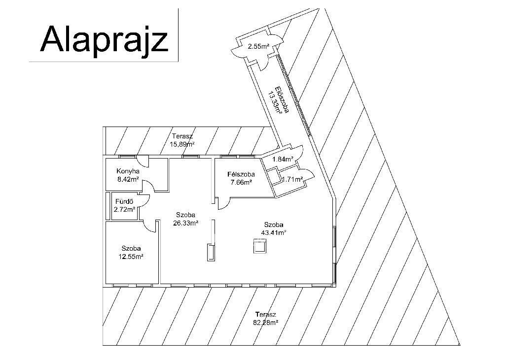 A lakás egy 2009-ben átadott 8 emeletes épület 8. emeltén helyezkedik el, tulajdonlap szerint 167 nm (118 nm + 99 nm terasz)