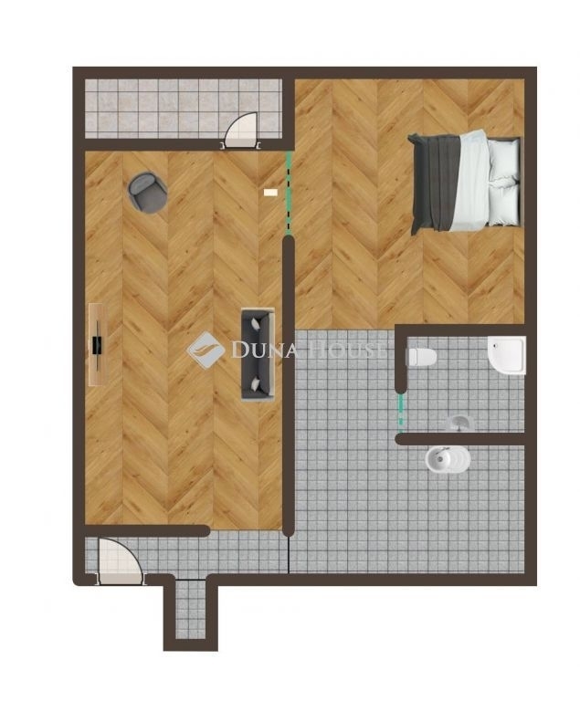 A fürdőszoba és a WC külön helyiségben található, ami praktikus és kényelmes elrendezést biztosít.