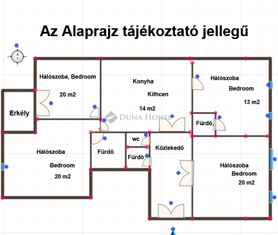 4 különnyíló hálószoba (20 m² + 20 m² + 20 m² + 13 m²)