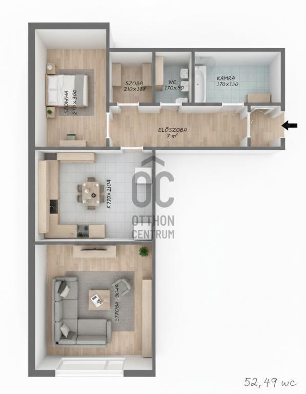 A praktikus elrendezés két külön nyíló szobát és egy modern kialakítású fürdőszobát kínál, amely a mai igényeknek megfelelően került megvalósításra.