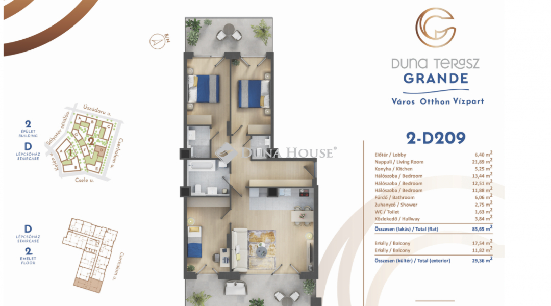 Főbb jellemzők:85,65 m²-es lakás, tökéletes elrendezés, 3 külön nyíló hálószoba, világos, tágas nappali, külön fürdő és zuhanyzó, 2 erkély, összesen közel 30 m² modern, új építésű környezet. Duna-parti elhelyezkedés, parkosított környezet.