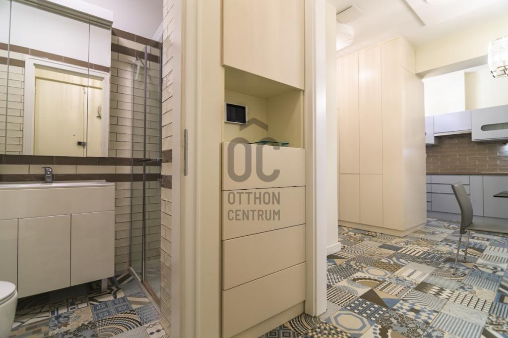 A biztonsági bejárati ajtón belépve az előszobában egy tükrös beépített szekrény fogad. Szemben a zuhanyzós fürdőszoba, jobbra az étkező található. itt mindenhol egyedi tervek alapján készült elegáns vonalvezetésű bútorok kerültek beépítésre. A közlekedőből nyílik még egy fürdőszoba , majd az impozáns nappaliba léphetünk, amely hatalmas ablakokkal, stílusos álmennyezettel és halszálkában rakott faparkettával fogad.