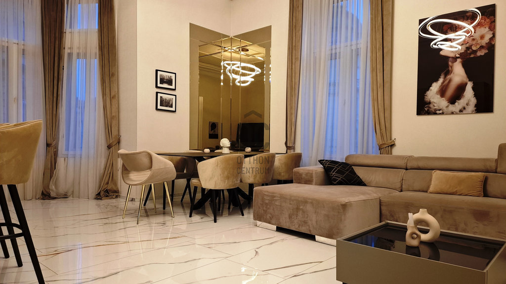 A 4. emeleti saroklakás pár éve teljeskörű műszaki és esztétikai felújításon esett át. A belsőépítész tervei szerint egyedi ajtók, bútorok és burkolatok kerültek beépítésre. A lakás különlegessége a fantasztikus hangulatot teremtő csillárok, amelyek exkluzív megjelenésükkel plusz eleganciát visznek a térbe.