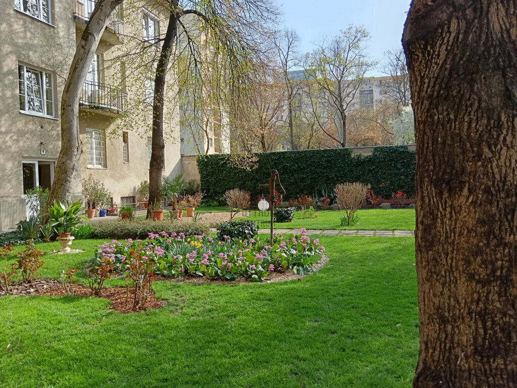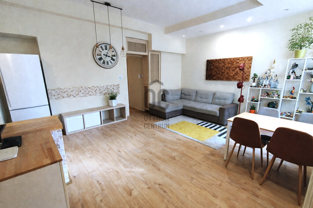 A nappali nem csak világos – konkrétan jó ott lenni. Kinézel, és nem a szomszéd ablak néz vissza, hanem egy szépen karbantartott belső kert. Zöld, csendes, élhető. Ritka kombó.