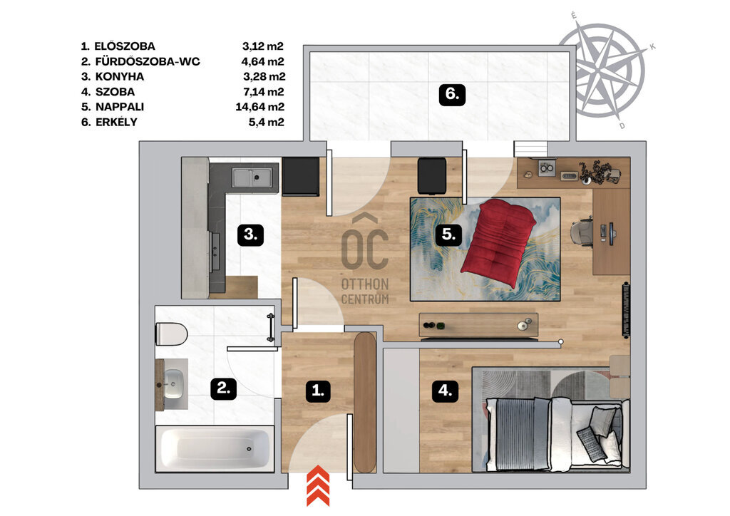 - Felosztása: előtér, amerikai konyhás nappali és étkező, leválasztott hálófülke, fürdőszoba-WC, erkély.