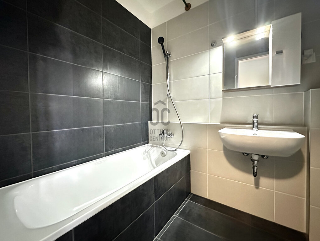 - A fürdőszobát modern színvilágú járólappal, a lakás többi részét fa mintás laminált padlóval burkolták.