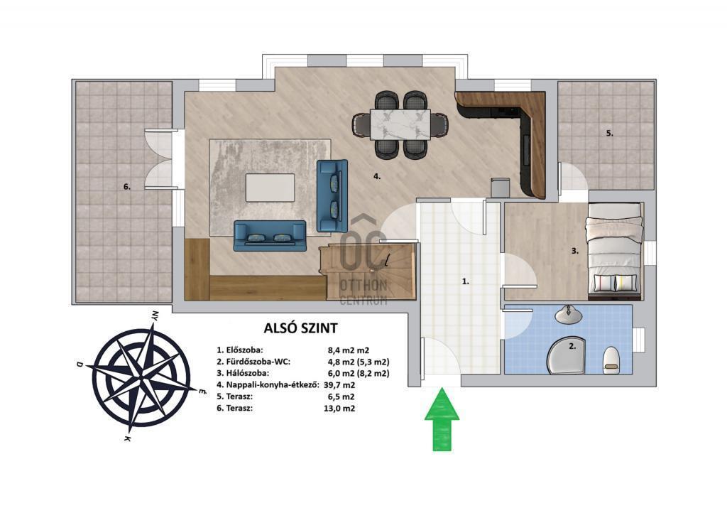 - Az alsó szint felosztása: előszoba, nappali-konyha-étkező, szoba, fürdőszoba-WC.
