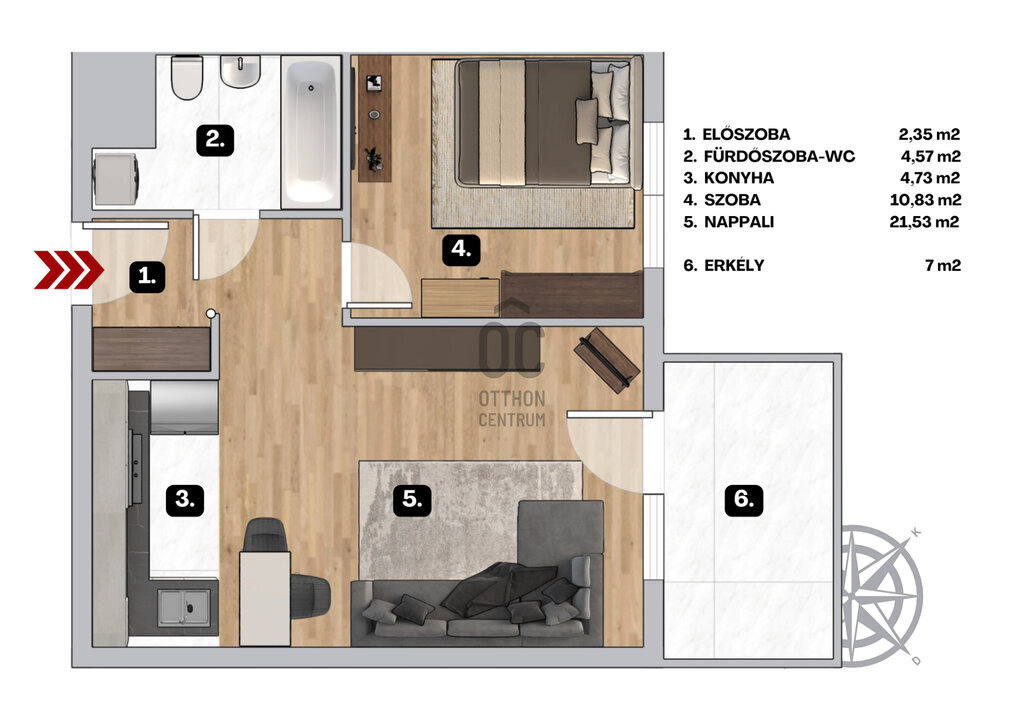 - Felosztása: előszoba, amerikai konyhás nappali és étkező erkély kapcsolattal, hálószoba, kádas fürdőszoba+toalett.