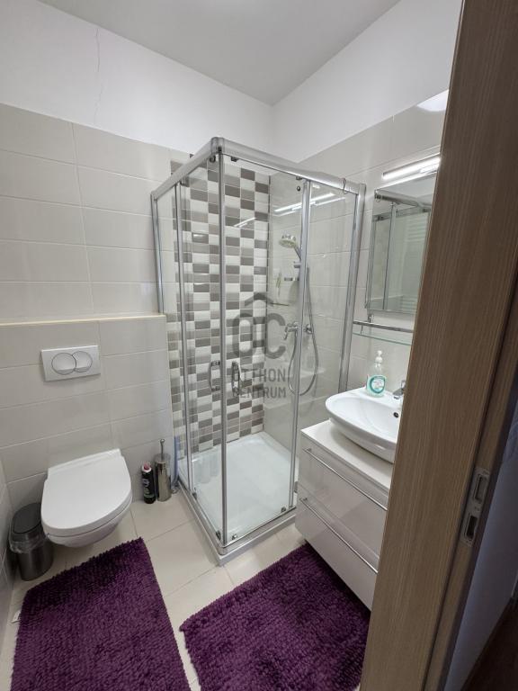 A fürdőszoba letisztult, mai stílusú burkolatokkal.