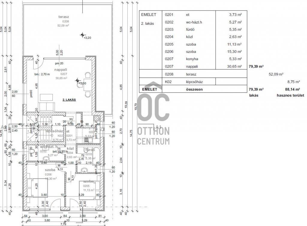Az első emeleti ingatlan 88nm-es, 3 szobával és 1 fürdőszobával rendelkezik, valamint egy 50- nm-es terasszal.
