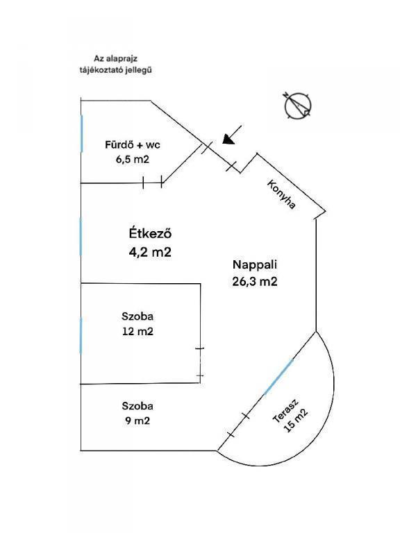 Modern, amerikai konyhás nappali, háló + félszoba, tágas fürdőszoba, valamint egy 15 m2-es terasz tartozik hozzá, KERTKAPCSOLATTAL.