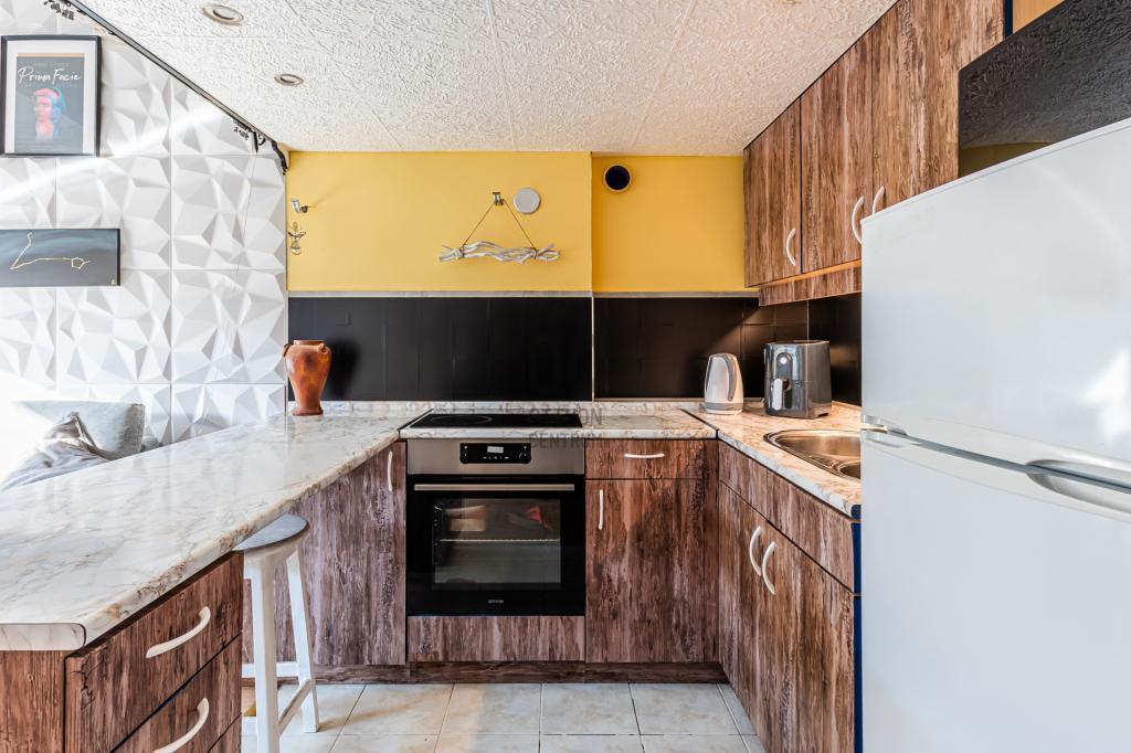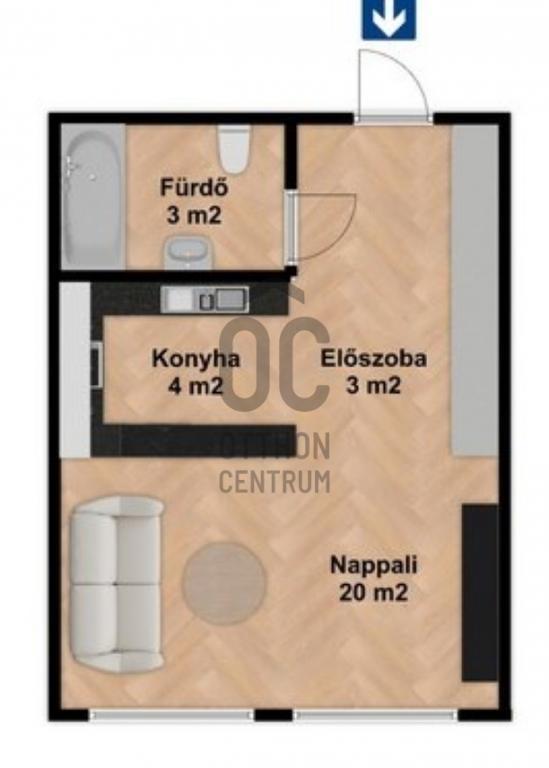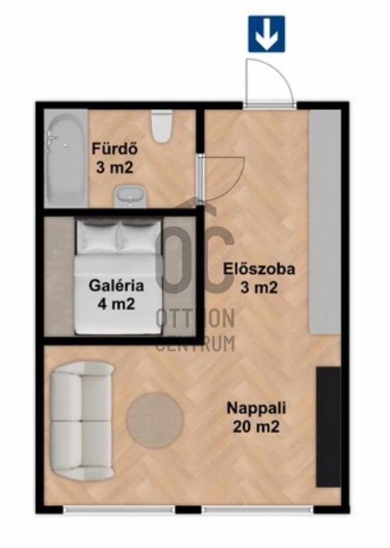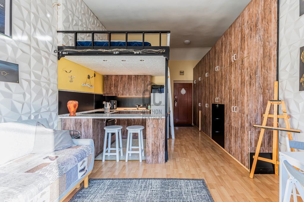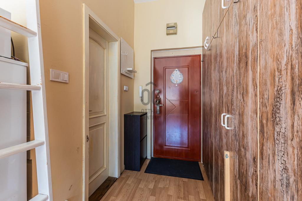 A kényelmes nappaliból paraktikus konyhasarok lett pulttal leválasztva, mely fölött egy 4 m-es alvó galéria is helyet kapott. Az előszobában található hatalmas gardróbszekrények rengeteg holmit elnyelnek. A fürdőszoba kádas, jó állapotú.