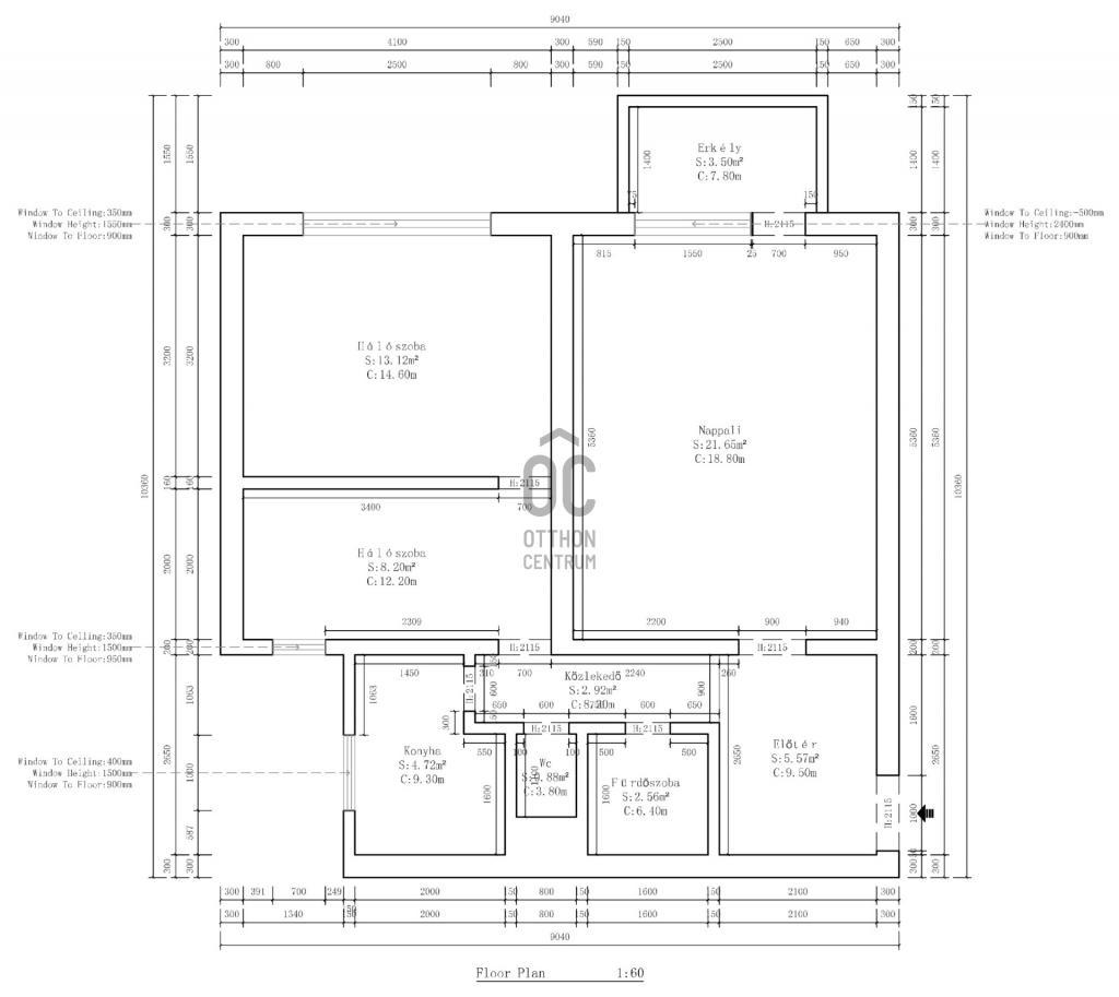 Lakás elosztása: előtér, közlekedő, erkélyes nappali, hálószoba, dolgozószoba, ablakos konyha, kádas fürdőszoba, külön WC.