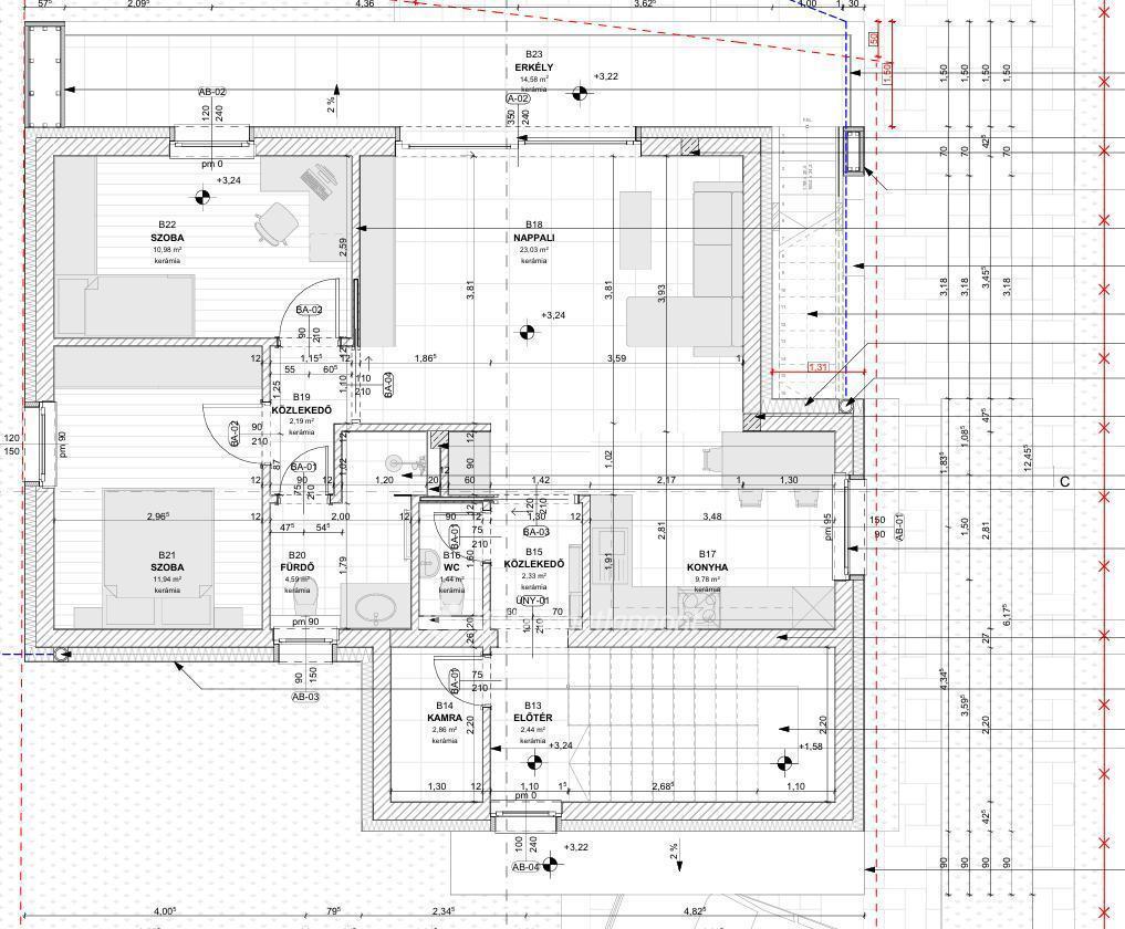 A épület, emeleti lakrész : nappali 23,03 nm; konyha 9,78 nm; szoba 10,98 nm; szoba 11,94 nm; fürdőszoba 4,59 nm; WC 1,44 nm; háztartási helyiség 2,86 nm; előtér 2,44 nm; közlekedők 4,52 nm; erkély 14,58 nm; +tetőterasz 79,42 nm.