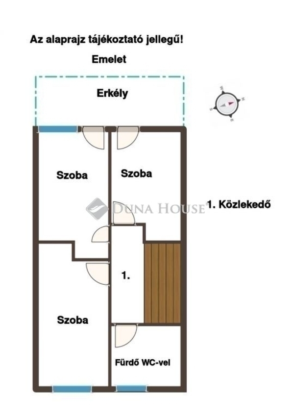 Az emeletre felérve jobbra 2 szoba található, mindkettő szobából ki lehet jutni a beépített erkélyre. Balra további egy szoba és a WC-s fürdőszoba található.