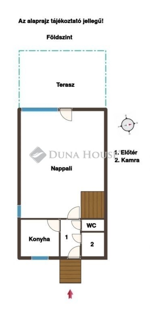 A lakásba belépve az előtérbe jutunk. Szemben a nappali, bal oldalon a konyha, jobbra a WC és mellette a kamra található.