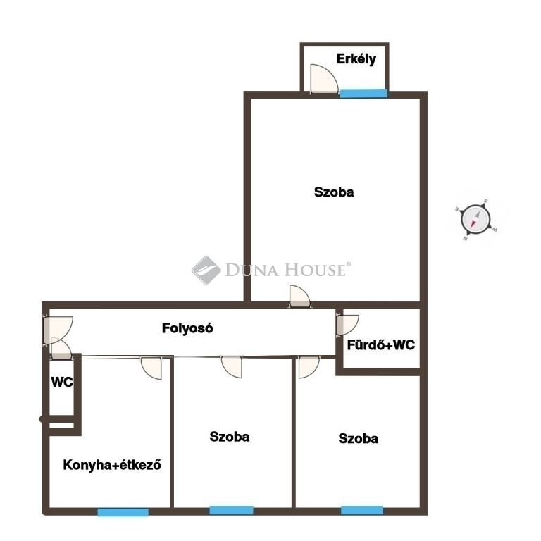 A lakás elosztása praktikus és kényelmes: három külön nyíló szoba található benne, amelyek közül kettő a csendes, gondozott belső udvarra néz, míg a harmadik szoba erkélyes, utcára nyíló kilátással. A szobák tágasak, jól berendezhetők, a konyha pedig a korábbi kamra területével bővült, így tágasabb és világosabb főzőteret kínál. A fürdőszoba WC-vel felszerelt, emellett egy különálló WC is rendelkezésre áll.