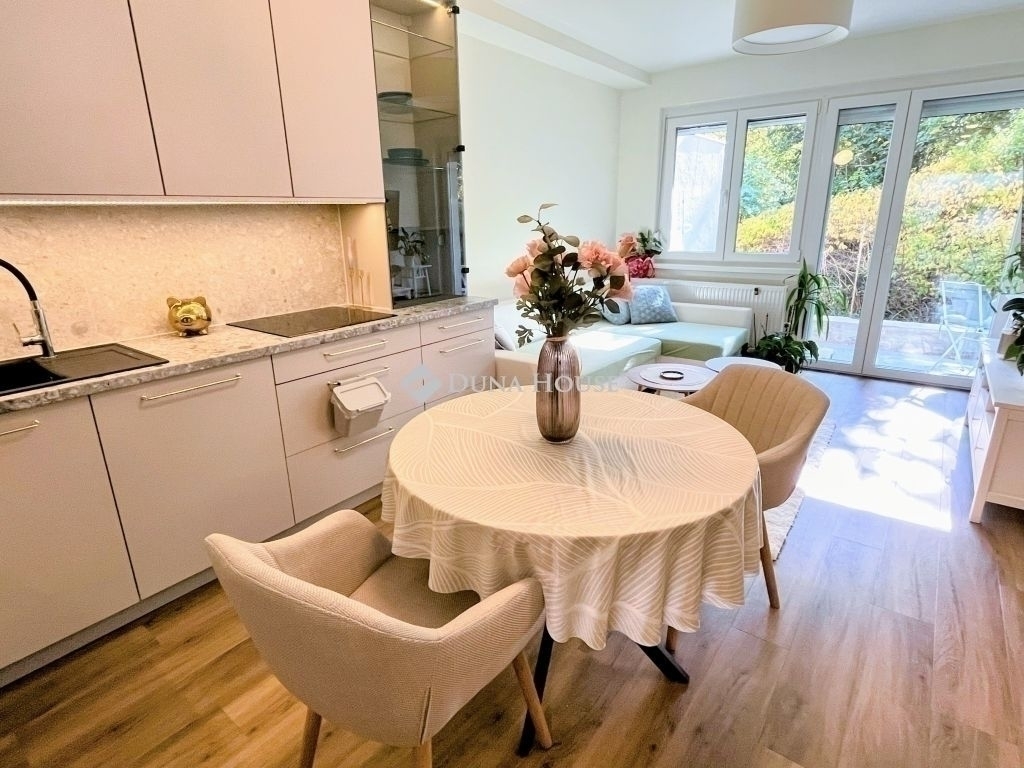 Napfényes, átgondolt, prémium minőségű otthon PasarétVirányos határánEladó egy minden részletében megtervezett, építész és belsőépítész által tervezett, teljes körűen felújított, földszinti (lépcsőzés nélküli) lakás a II. kerület Kurucles városrészében, PasarétVirányos határán, csendes, rendezett környezetben.A 60 m²-es (tulajdoni lapon 66 m²) otthon napfényes, déli fekvésű kertre néző terekkel és intim, saját terasszal rendelkezik, ahol nincs belátás csak a kert és a nyugalom. A lakás főbb jellemzői:Átgondolt, építészeti precizitással megtervezett térkialakításNappali + 2 külön nyíló szoba2 fürdőszoba és 2 WCKülön háztartási helyiség ritkaság ebben a méretkategóriábanGázcirkó fűtés, kiegészítve elektromos padlófűtéssel a maximális komfortértPrémium anyaghasználat: új burkolatok, radiátorok, csövezés, elektromos hálózat (3×16A), rejtett tolóajtók, minőségi nyílászárókNagy méretű, modern konyha AEG beépített gépekkel a vételár részekéntSzámos beépített szekrény és rejtett tároló megoldásSaját garázs és tároló, valamint kertkapcsolatA lakás minden részletében a tudatos tervezés köszön vissza: nemcsak szép, hanem élhető, logikus és hosszú távra is kényelmes otthon.A kivitelezés új, minden gépészet, burkolat és szerelvény frissen cserélt így semmilyen további ráfordítást nem igényel. A ház és környezete:Rendezett, gondozott kert, parkosított udvarKulturált, igényes lakóközösségCsendes, zöldövezeti környezet, kiváló közlekedéssel Parkolás:Saját, zárható garázsTovábbi tárolóhely a lakáshoz tartozikEz az otthon fiatal pároknak, kisgyermekes családoknak, vagy idősebbeknek is ideális választás: kényelmes, lépcsőzésmentes, napfényes, és minden részletében harmóniát sugároz.Világos, praktikus és elegáns egy otthon, amit élni terveztek, nem csak használni.
